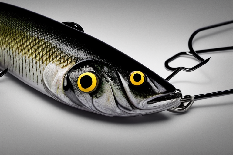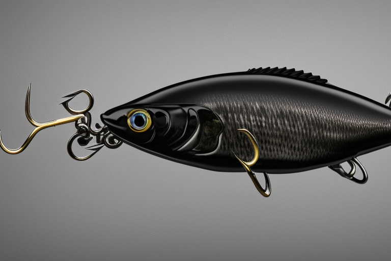 Stable Diffusion AI Prompt product photography of a fishing lure with hooks that looks like a Black colored Bass!!!, (anatomically correct), futuristic, uhd, highly detailed, concept, product studio shot, panoramic shot, centered!!!, diffused lighting on a plain dark background, highly detailed, masterpiece, product photography by Wlop and Jovana Rikalo