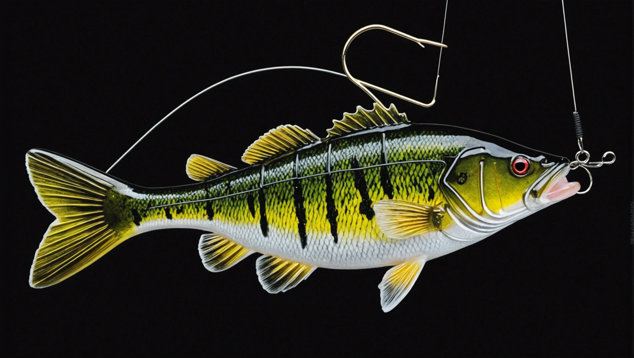 Fishing lure with fishing hooks like (((Black Bass))). A studio shot masterpiece lure product photo centered on a (black background).
