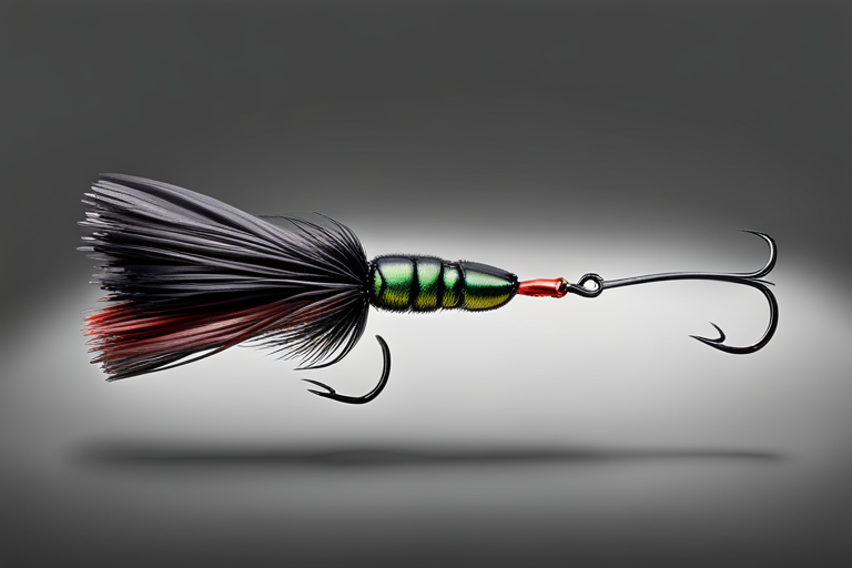 Stable Diffusion AI Prompt Fishing lure precisely mimics the exact shape and colors of a (((Black Beetle))). A panoramic studio shot of the highly detailed Black colored ((Beetle-shaped)) fishing lure with treble hooks designed to catch fish, centered product photography. A masterpiece product photo on a (black background).