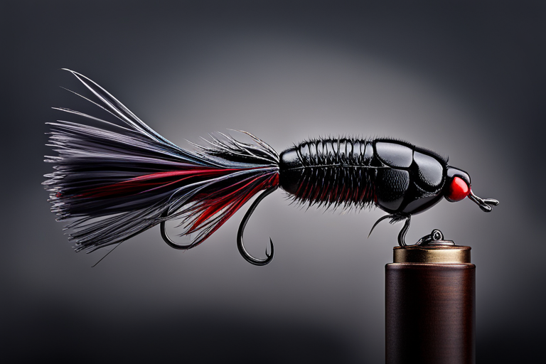 Stable Diffusion AI Prompt Fishing lure precisely mimics the exact shape and colors of a (((Black Beetle))). A panoramic studio shot of the highly detailed Black colored ((Beetle-shaped)) fishing lure with treble hooks designed to catch fish, centered product photography. A masterpiece product photo on a (black background).