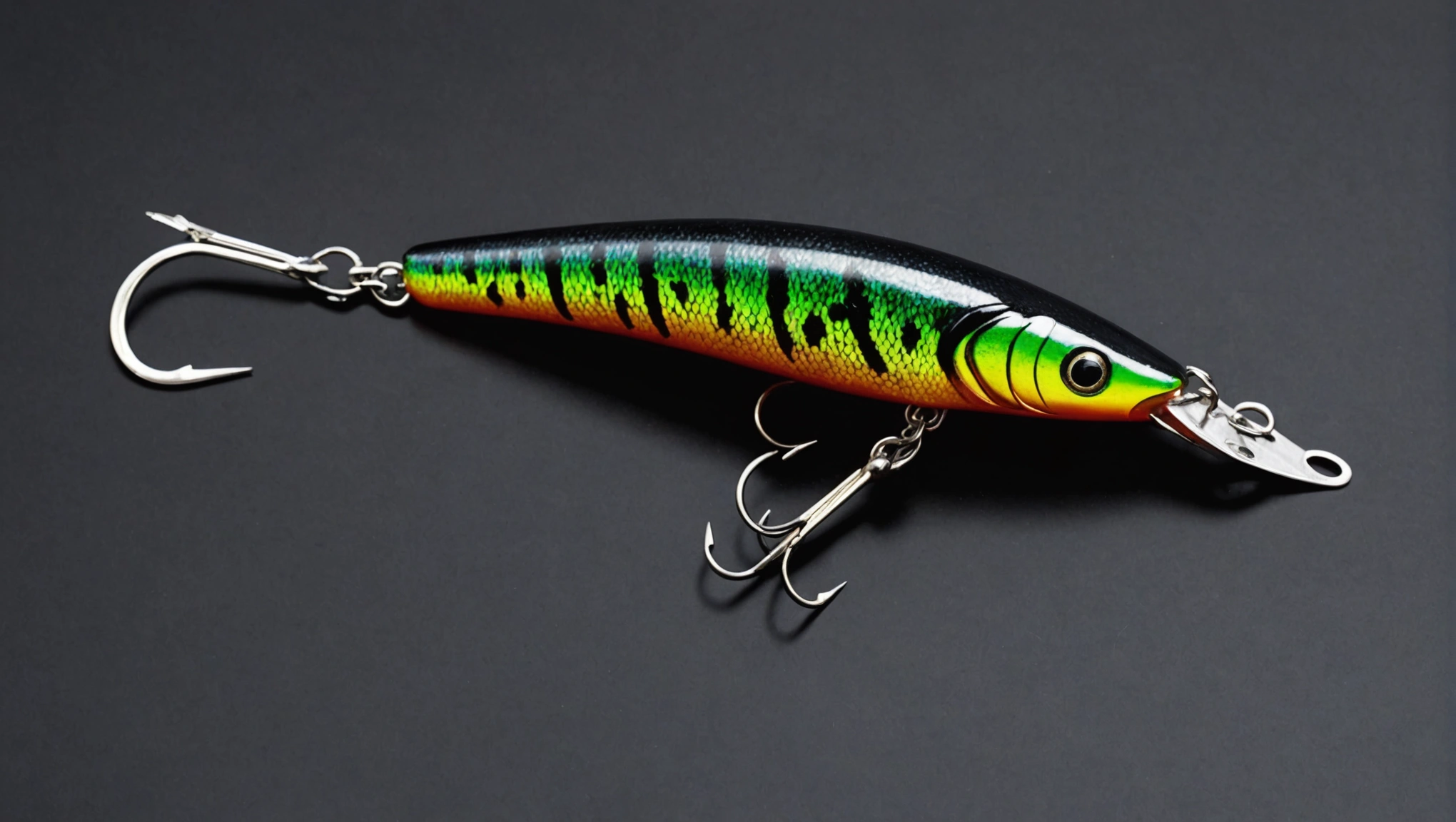 Fishing lure with fishing hooks like (((Black Crank bait))). A studio shot masterpiece lure product photo centered on a (black background).