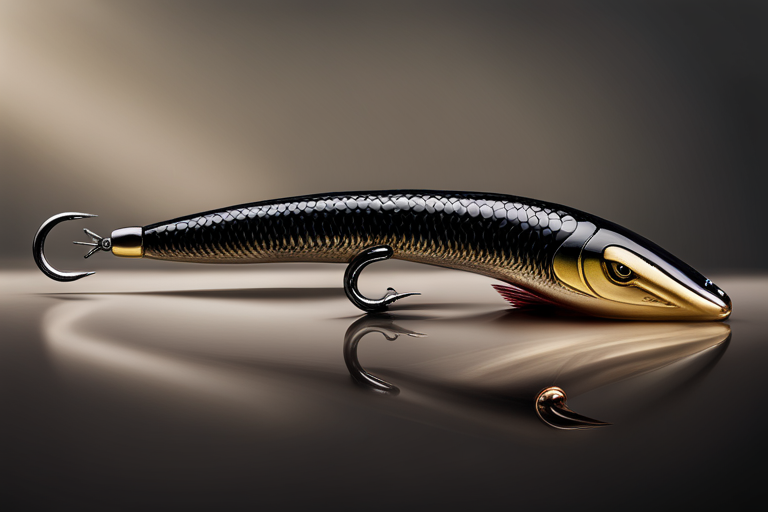 Stable Diffusion AI Prompt Fishing lure precisely mimics the exact shape and colors of a (((Black Eel))). A panoramic studio shot of the highly detailed Black colored ((Eel-shaped)) fishing lure with treble hooks designed to catch fish, centered product photography. A masterpiece product photo on a (black background).