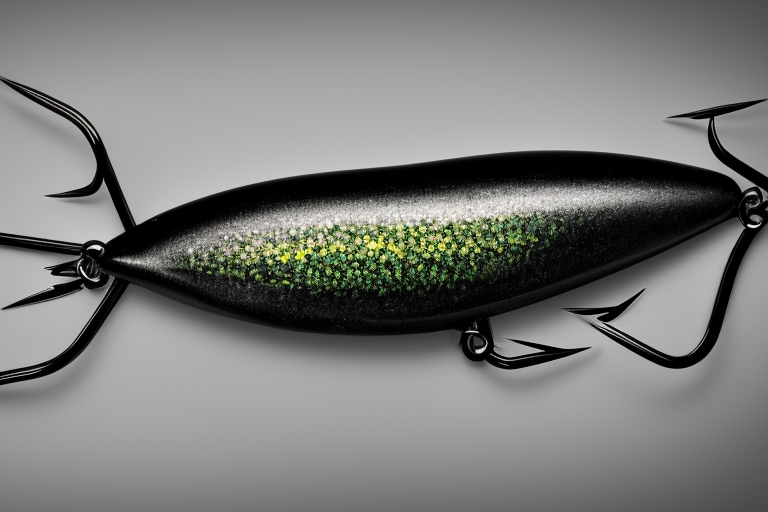 Stable Diffusion AI Prompt product photography of a fishing lure with hooks that looks like a Black colored Minnow!!!, (anatomically correct), futuristic, uhd, highly detailed, concept, product studio shot, panoramic shot, centered!!!, diffused lighting on a plain dark background, highly detailed, masterpiece, product photography by Jovana Rikalo