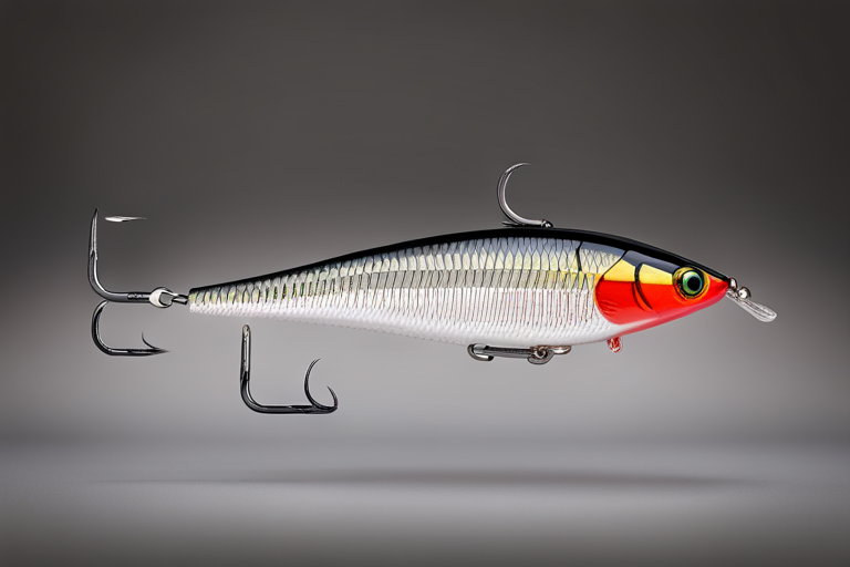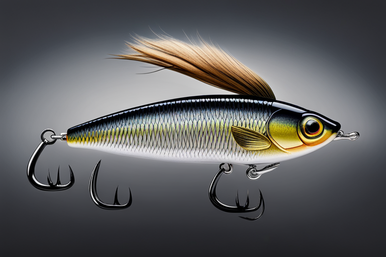 Stable Diffusion AI Prompt Fishing lure precisely mimics the exact shape and colors of a (((Black Minnow))). A panoramic studio shot of the highly detailed Black colored ((Minnow-shaped)) fishing lure with treble hooks designed to catch fish, centered product photography. A masterpiece product photo on a (black background).