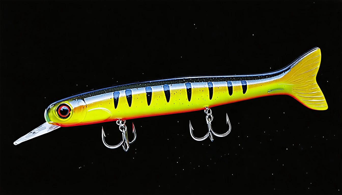 Fishing lure with fishing hooks like (((Black muskie))). A studio shot masterpiece lure product photo centered on a (black background).