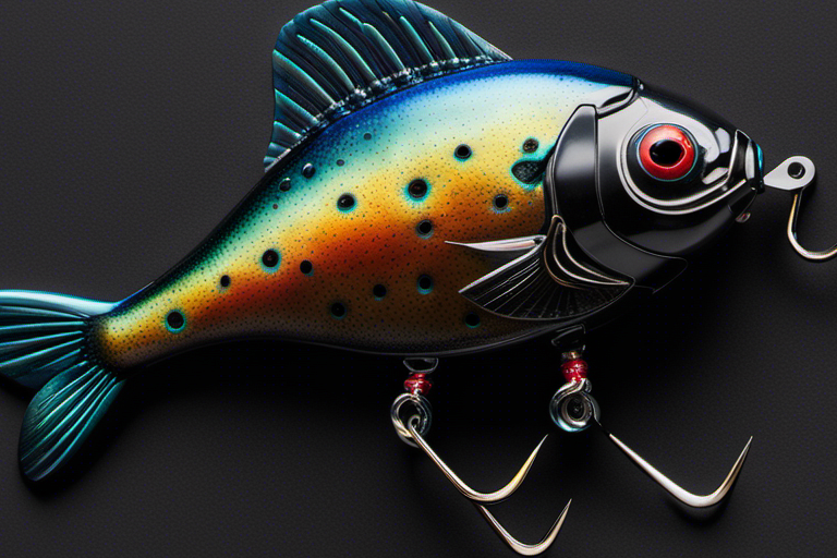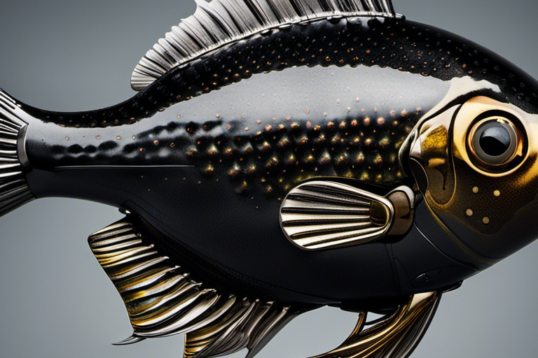 Stable Diffusion AI Prompt product photography of a fishing lure with hooks looks like a Black colored Sunfish!!!, (anatomically correct), futuristic, uhd, highly detailed, concept, product studio shot, panoramic shot, centered!!!, diffused lighting on a plain dark background, highly detailed, masterpiece, product photography by Jovana Rikalo