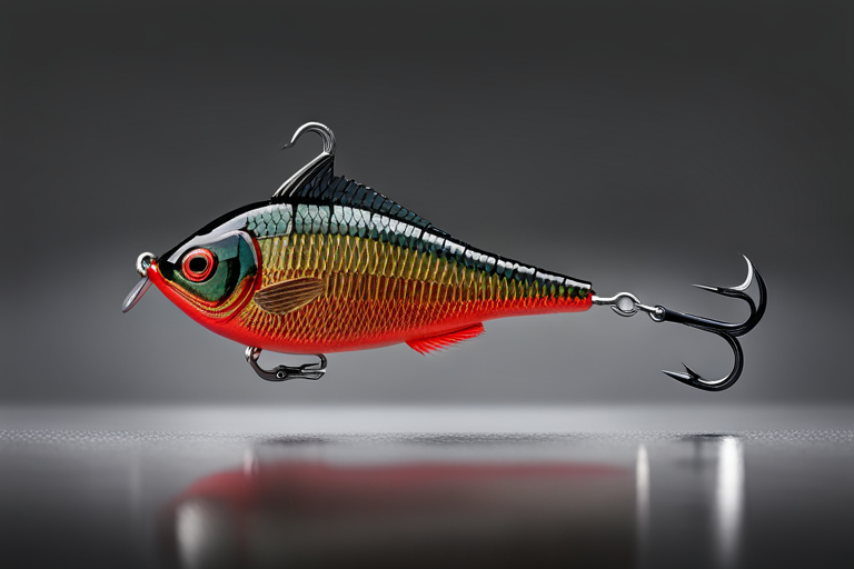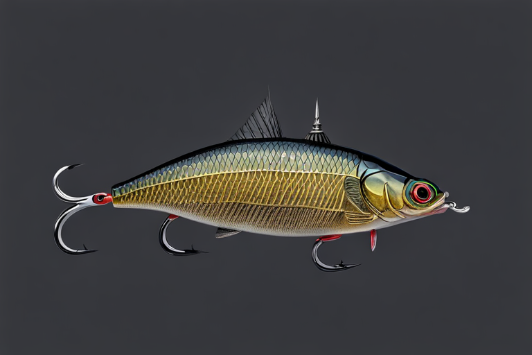 Stable Diffusion AI Prompt Fishing lure precisely mimics the exact shape and colors of a (((Black Sunfish))). A panoramic studio shot of the highly detailed Black colored ((Sunfish-shaped)) fishing lure with treble hooks designed to catch fish, centered product photography. A masterpiece product photo on a (black background).