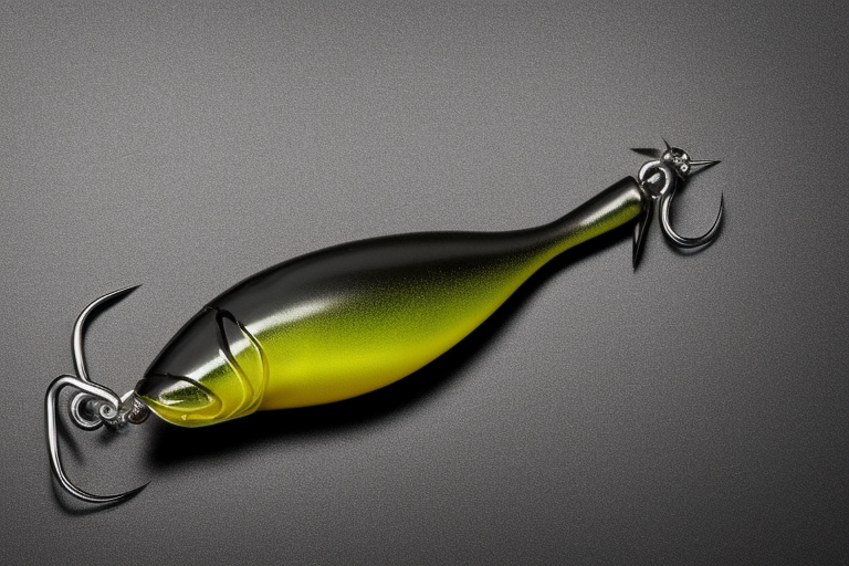 Stable Diffusion AI Prompt product photography of a fishing lure with hooks that looks like a Black colored Tadpole!!!, (anatomically correct), futuristic, uhd, highly detailed, concept, product studio shot, panoramic shot, centered!!!, diffused lighting on a plain dark background, highly detailed, masterpiece, product photography by Wlop and Jovana Rikalo