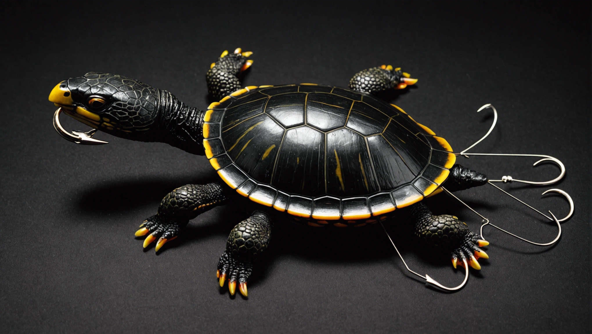 Fishing lure with fishing hooks like (((Black Turtle))). A studio shot masterpiece lure product photo centered on a (black background).