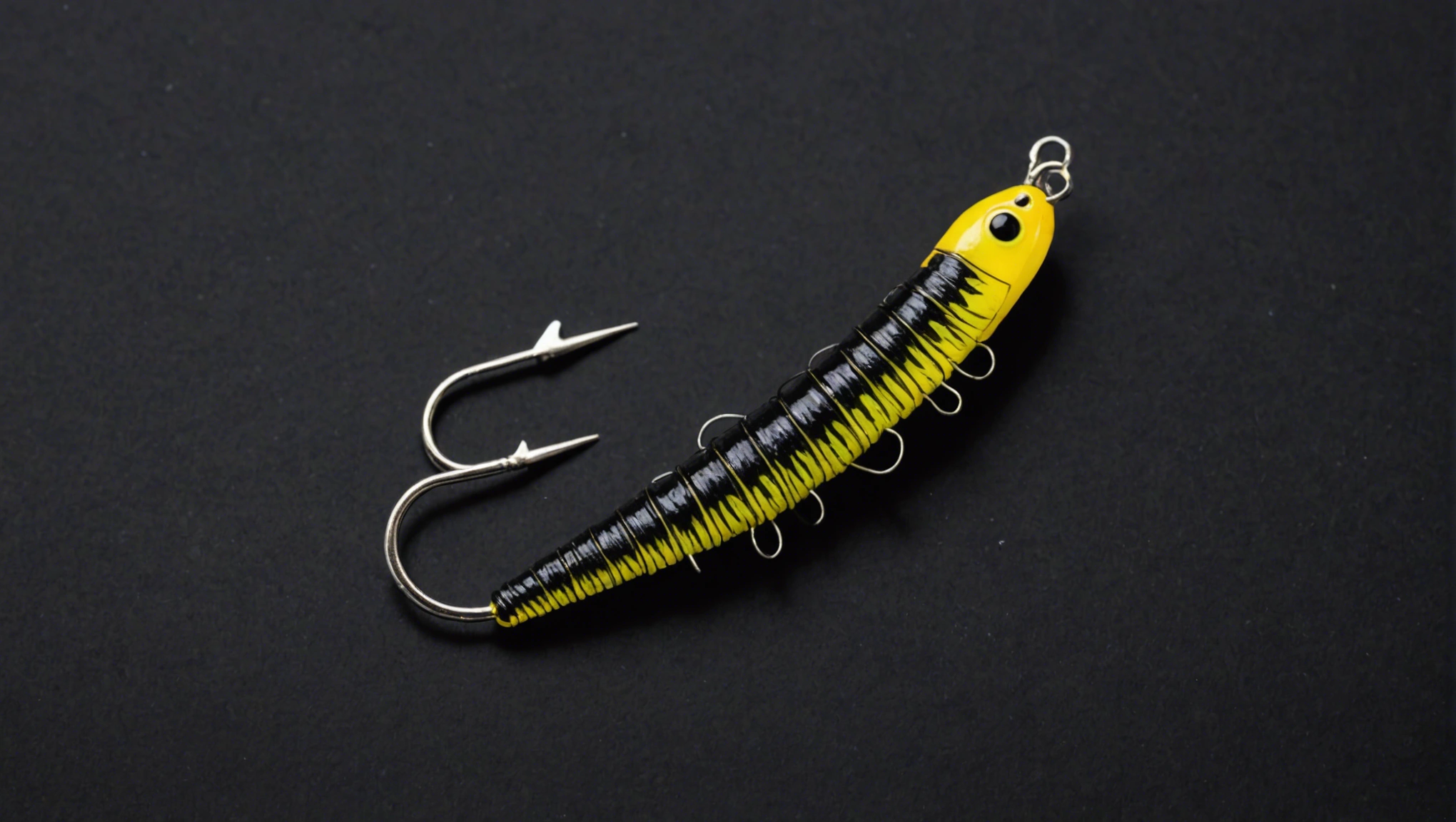 Fishing lure with fishing hooks like (((Black Worm))). A studio shot masterpiece lure product photo centered on a (black background).