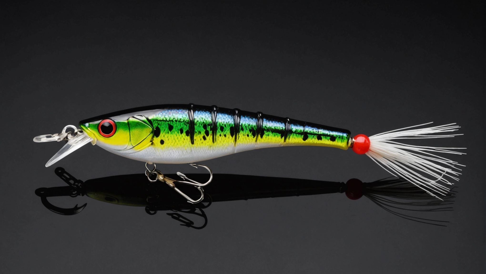 Fishing lure with fishing hooks like (((Black Yo Mama))). A studio shot masterpiece lure product photo centered on a (black background).