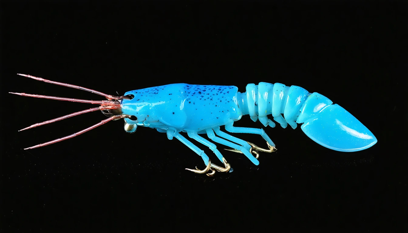 Fishing lure with fishing hooks like (((Blue Crawfish))). A studio shot masterpiece lure product photo centered on a (black background).