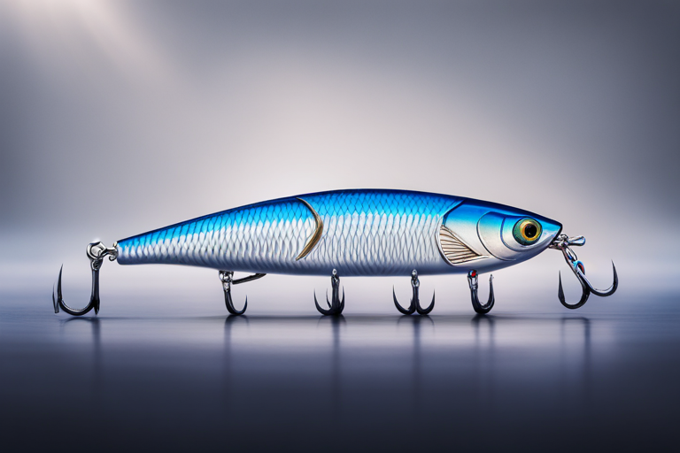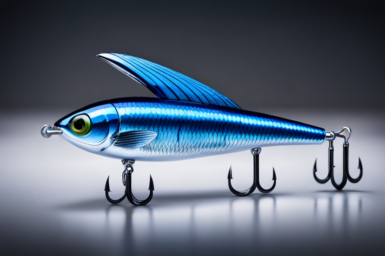 Stable Diffusion AI Prompt panoramic shot!!!, centered!!! fishing lure with hooks looks like a Blue colored Shad!!!, (anatomically correct), futuristic, uhd, highly detailed, concept, product studio shot, diffused lighting on a plain dark background, highly detailed, masterpiece, product photography by Jovana Rikalo