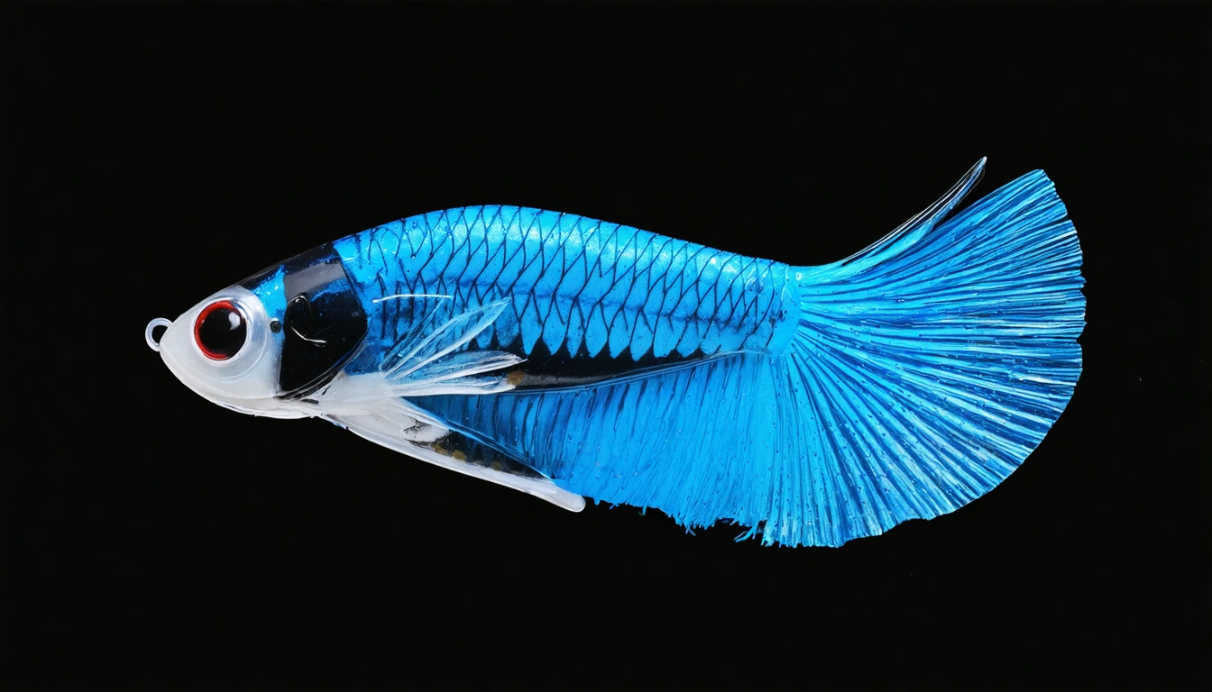 Fishing lure with fishing hooks like (((Blue Siamese Fish))). A studio shot masterpiece lure product photo centered on a (black background).