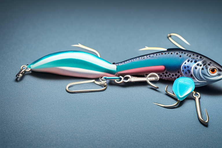 Stable Diffusion AI Prompt product photography of a fishing lure with hooks that looks like a Blue colored Trout!!!, (anatomically correct), futuristic, uhd, highly detailed, concept, product studio shot, panoramic shot, centered!!!, diffused lighting on a plain dark background, highly detailed, masterpiece, product photography by Wlop and Jovana Rikalo