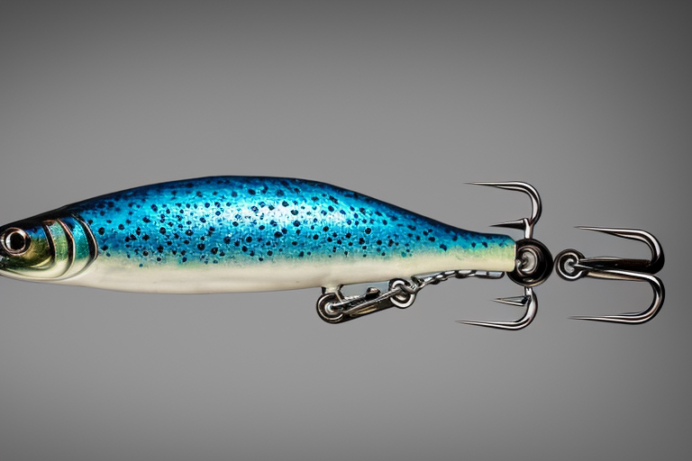 Stable Diffusion AI Prompt product photography of a fishing lure with hooks that looks like a Blue colored Trout!!!, (anatomically correct), futuristic, uhd, highly detailed, concept, product studio shot, panoramic shot, centered!!!, diffused lighting on a plain dark background, highly detailed, masterpiece, product photography by Jovana Rikalo