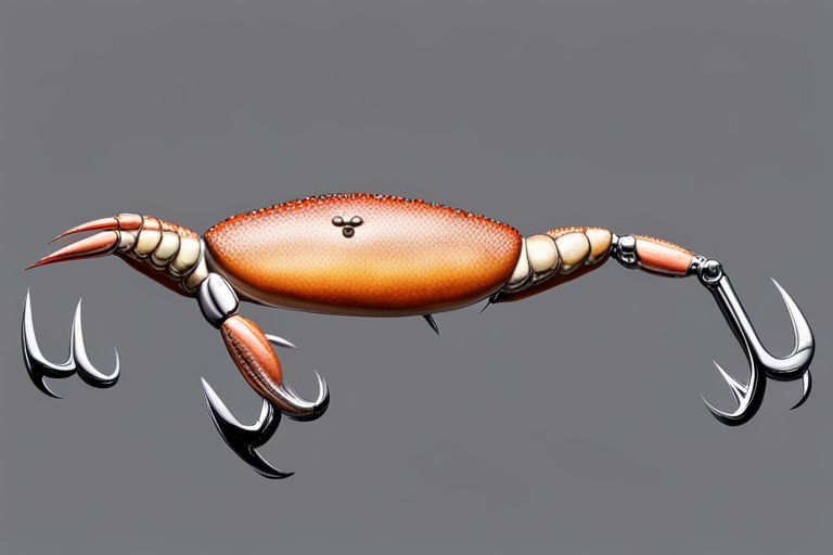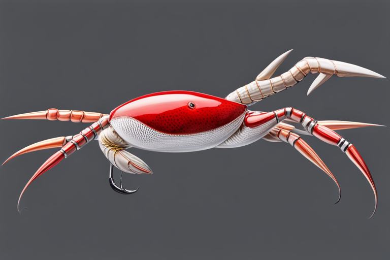 Stable Diffusion AI Prompt Fishing lure precisely mimics the exact shape and colors of a (((bread Crab))). A panoramic studio shot of the highly detailed bread colored ((Crab-shaped)) fishing lure with treble hooks designed to catch fish, centered product photography. A masterpiece product photo on a (black background).