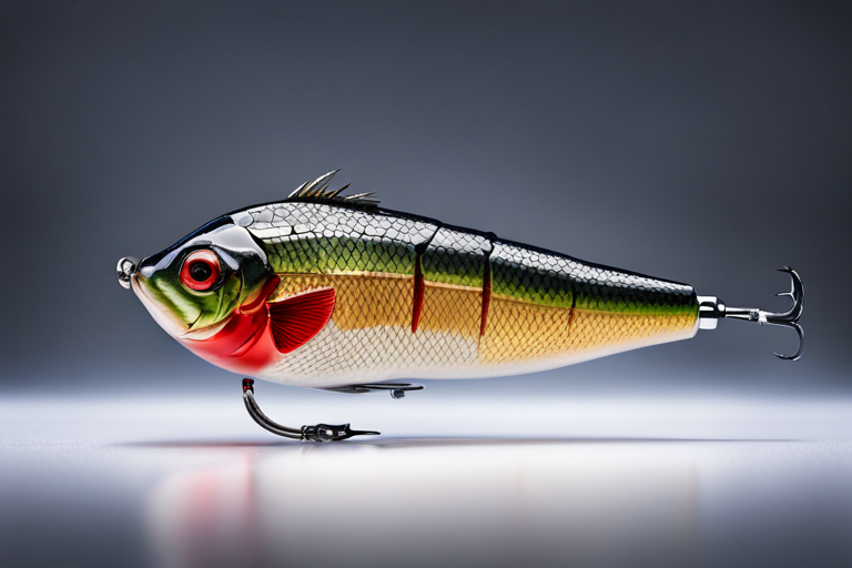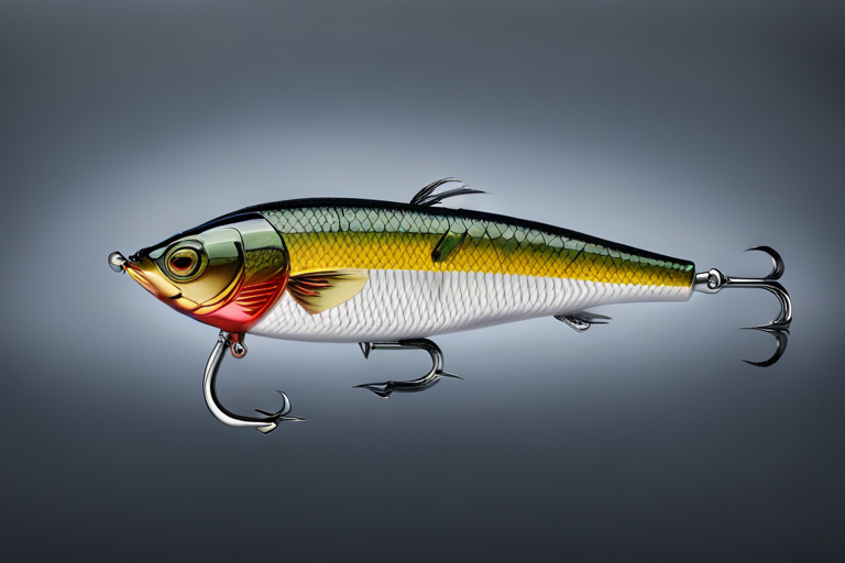 Stable Diffusion AI Prompt panoramic shot!!!, centered!!! fishing lure with hooks looks like a Brown colored Bass!!!, (anatomically correct), futuristic, uhd, highly detailed, concept, product studio shot, diffused lighting on a plain dark background, highly detailed, masterpiece, product photography by Jovana Rikalo