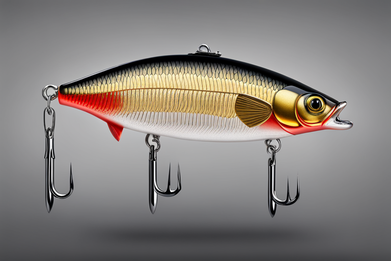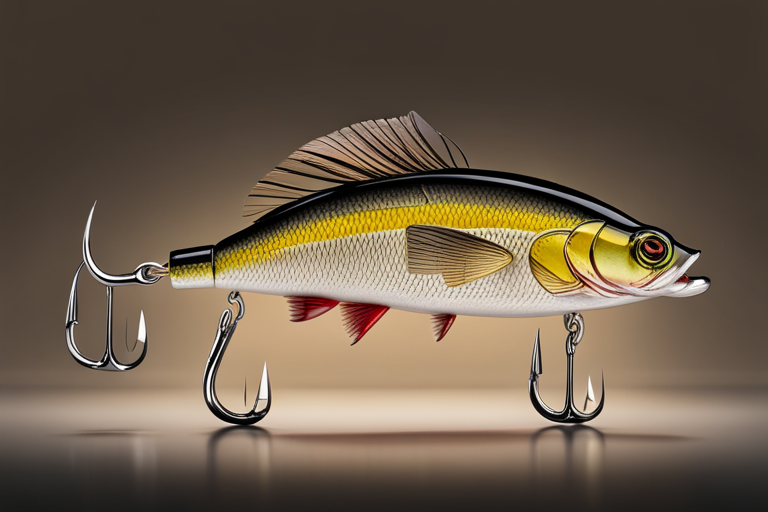 Stable Diffusion AI Prompt Fishing lure precisely mimics the exact shape and colors of a (((Brown Bass))). A panoramic studio shot of the highly detailed Brown colored ((Bass-shaped)) fishing lure with treble hooks designed to catch fish, centered product photography. A masterpiece product photo on a (black background).