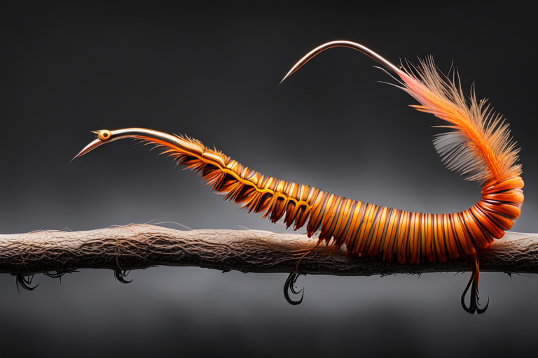 Stable Diffusion AI Prompt Fishing lure precisely mimics the exact shape and colors of a (((Brown Caterpillar))). A panoramic studio shot of the highly detailed Brown colored ((Caterpillar-shaped)) fishing lure with treble hooks designed to catch fish, centered product photography. A masterpiece product photo on a (black background).
