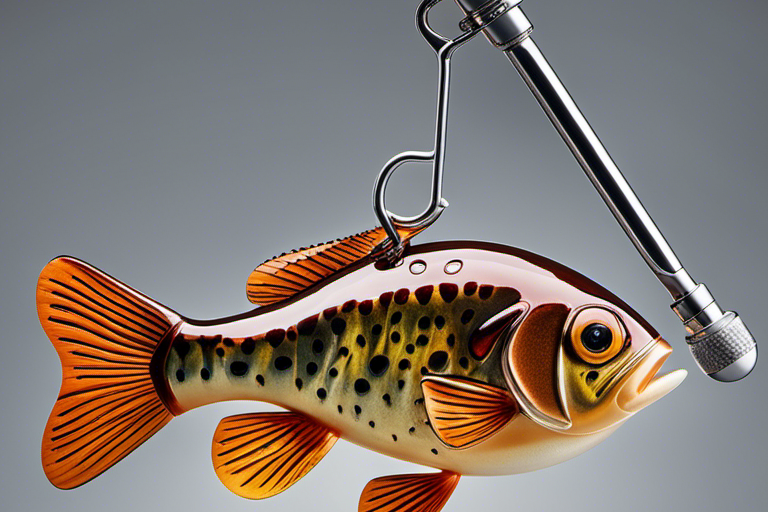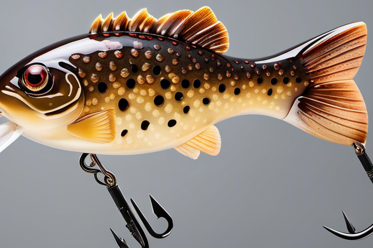 Stable Diffusion AI Prompt product photography of a fishing lure with hooks that looks like a Brown colored Crappie!!!, (anatomically correct), futuristic, uhd, highly detailed, concept, product studio shot, panoramic shot, centered!!!, diffused lighting on a plain dark background, highly detailed, masterpiece, product photography by Jovana Rikalo