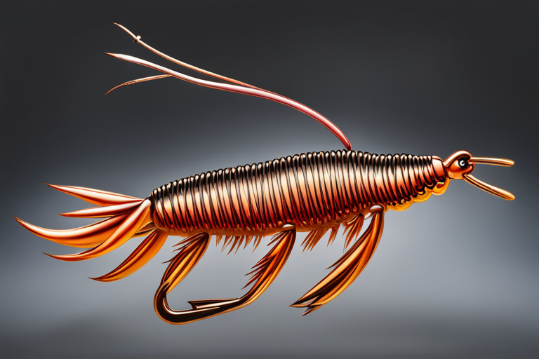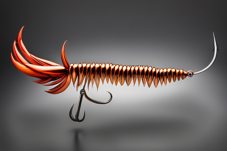 Stable Diffusion AI Prompt Fishing lure precisely mimics the exact shape and colors of a (((Brown Crawfish))). A panoramic studio shot of the highly detailed Brown colored ((Crawfish-shaped)) fishing lure with treble hooks designed to catch fish, centered product photography. A masterpiece product photo on a (black background).