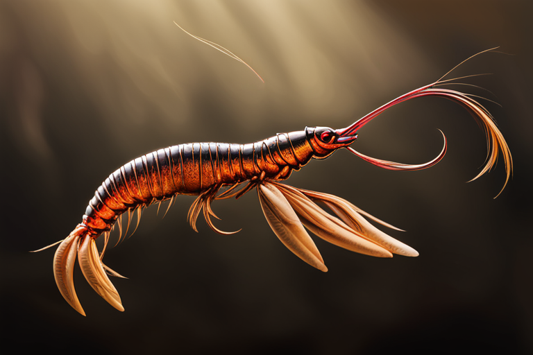Stable Diffusion AI Prompt Fishing lure precisely mimics the exact shape and colors of a (((Brown Crawfish))). A panoramic studio shot of the highly detailed Brown colored ((Crawfish-shaped)) fishing lure with treble hooks designed to catch fish, centered product photography. A masterpiece product photo on a (black background).