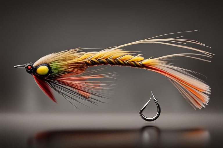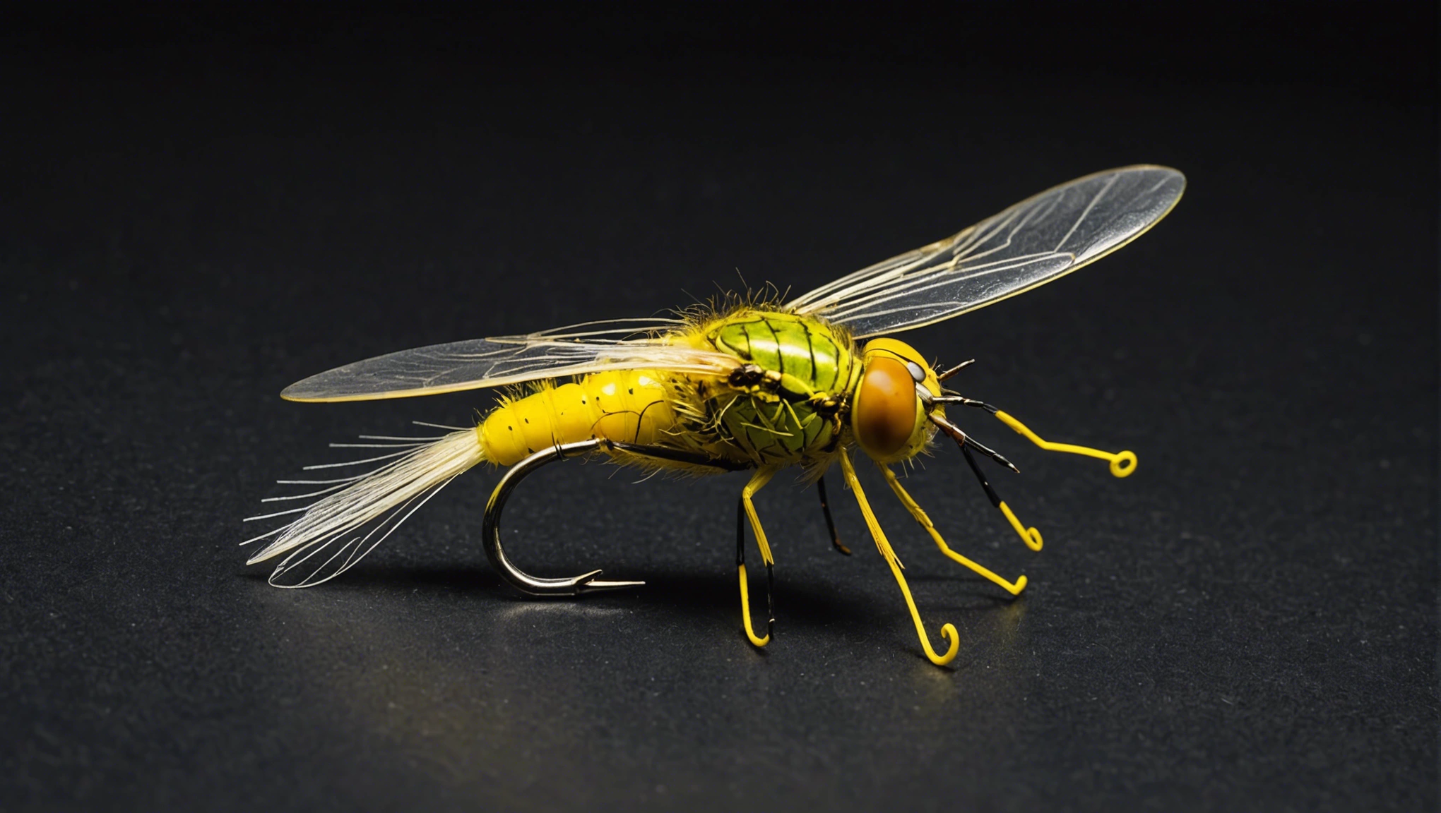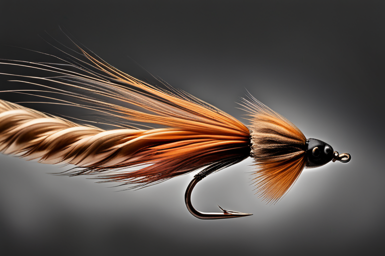 Stable Diffusion AI Prompt Fishing lure precisely mimics the exact shape and colors of a (((Brown Fly))). A panoramic studio shot of the highly detailed Brown colored ((Fly-shaped)) fishing lure with treble hooks designed to catch fish, centered product photography. A masterpiece product photo on a (black background).