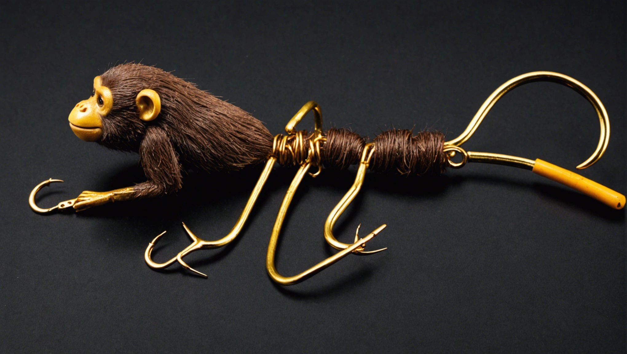 Fishing lure with fishing hooks like (((Brown Monkey ))). A studio shot masterpiece lure product photo centered on a (black background).