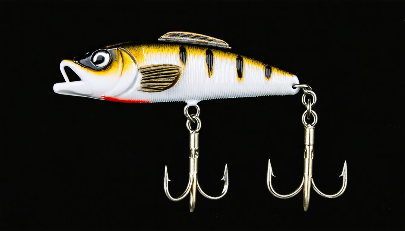 Fishing lure with fishing hooks like (((Brown Perch))). A studio shot masterpiece lure product photo centered on a (black background).