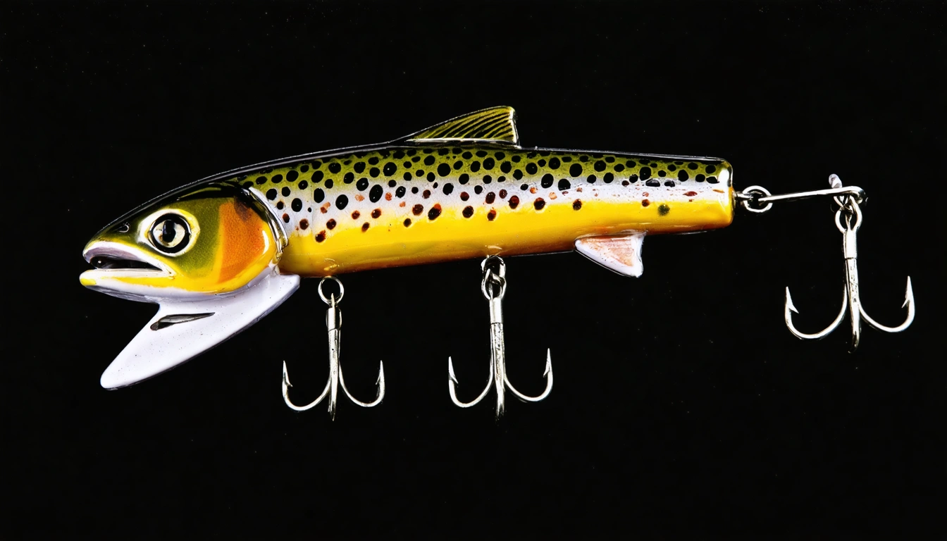 Fishing lure with fishing hooks like (((Brown Trout))). A studio shot masterpiece lure product photo centered on a (black background).