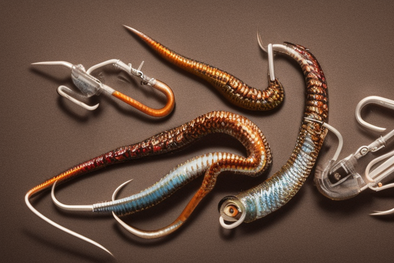 Stable Diffusion AI Prompt fishing lure with hooks looks like a Brown colored Worm!!!, (anatomically correct), futuristic, uhd, highly detailed, concept, product studio shot, panoramic shot!!!, centered!!!, diffused lighting on a plain dark background, highly detailed, masterpiece, product photography by Jovana Rikalo