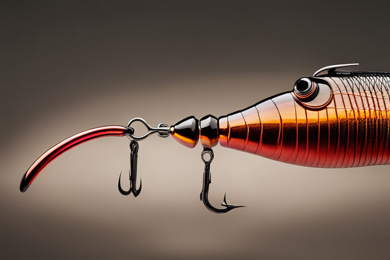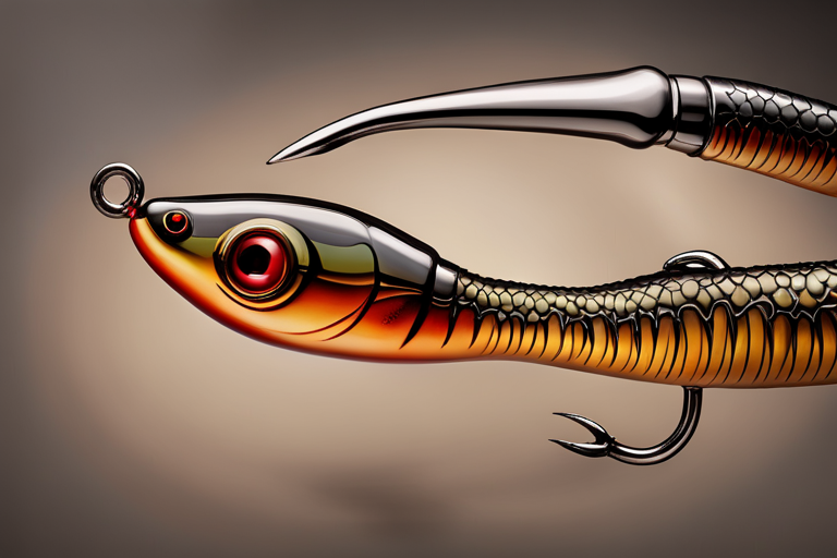 Stable Diffusion AI Prompt The lure precisely mimics the exact (((shape and colors of a Brown Worm))). A panoramic studio shot of the highly detailed conceptual Worm-shaped fishing lure designed to catch bass, centered in the image. It has treble hooks and is Brown in color. The lure is lit with diffused lighting against a plain dark background. A masterpiece product photo by photographer Jovana Rikalo.