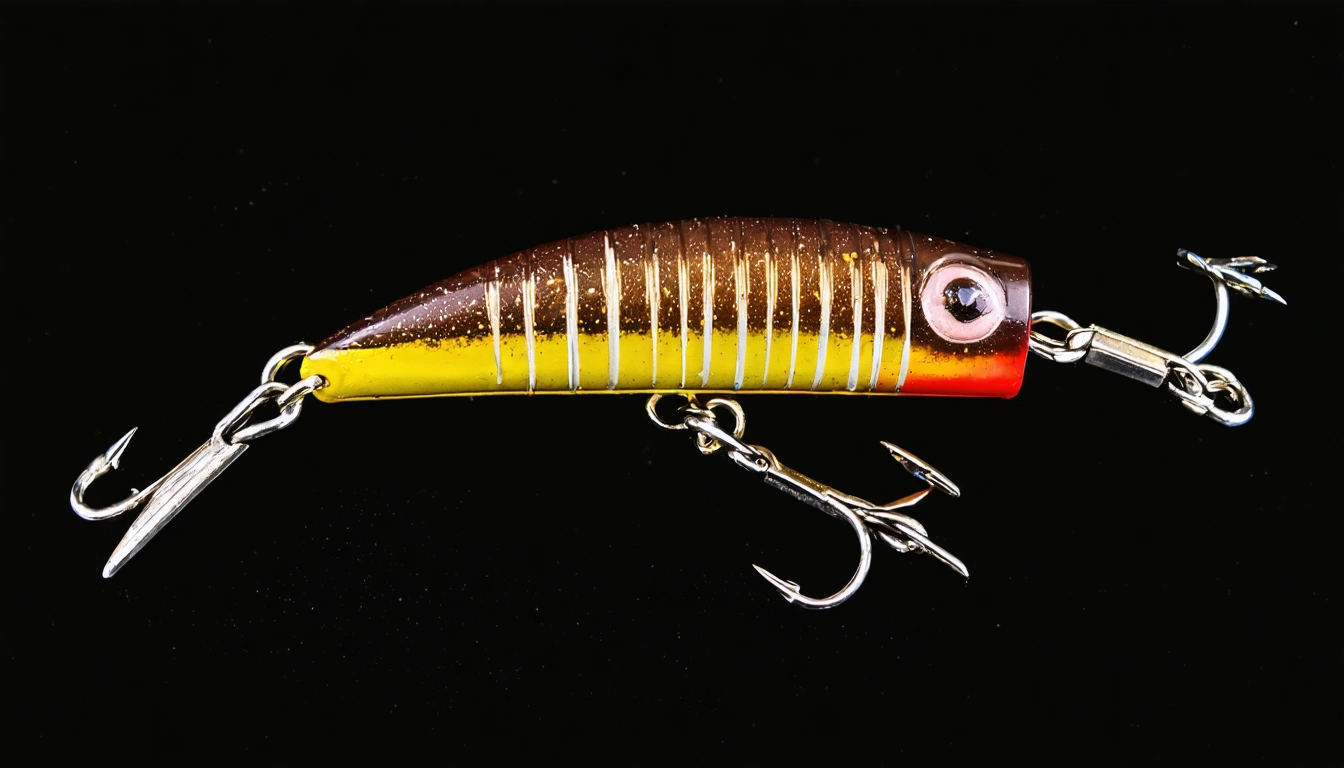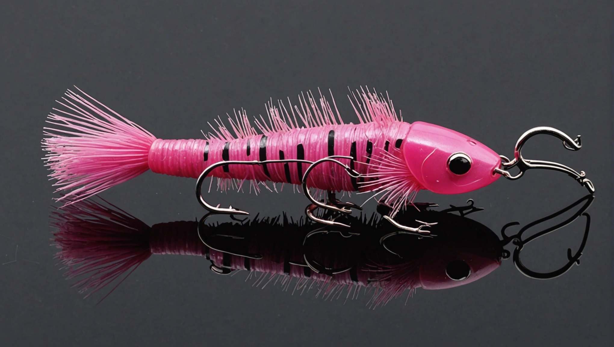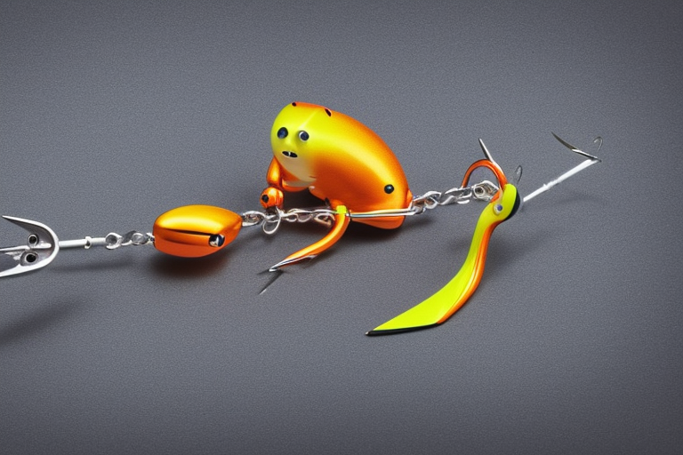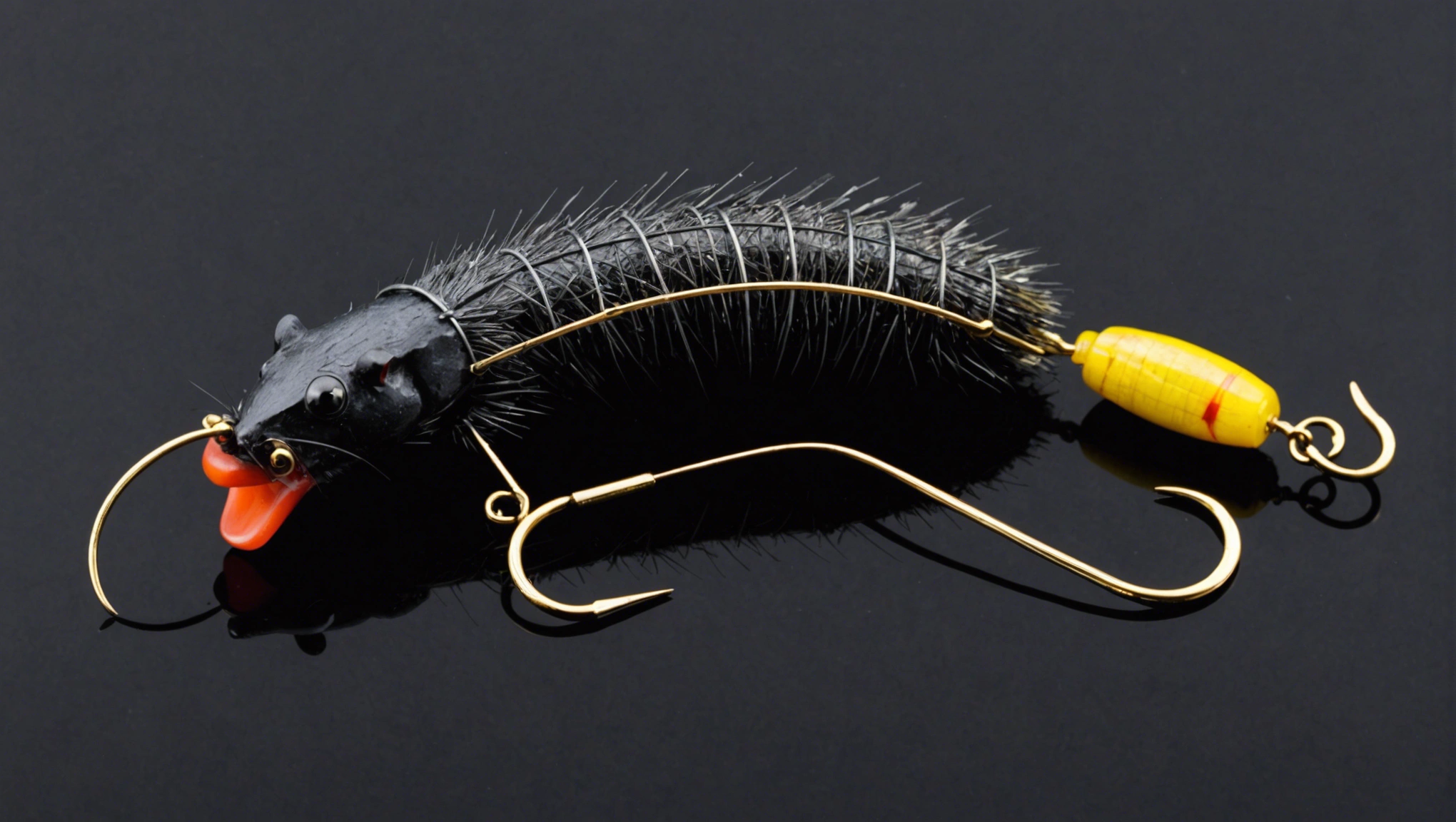 Stable Diffusion AI Prompt product photography of a fishing lure with hooks that looks like a Buzzbait colored Rodent!!!, (anatomically correct), futuristic, uhd, highly detailed, concept, product studio shot, panoramic shot, centered!!!, diffused lighting on a plain dark background, highly detailed, masterpiece, product photography by Jovana Rikalo