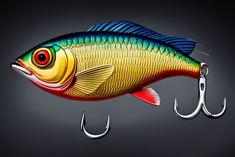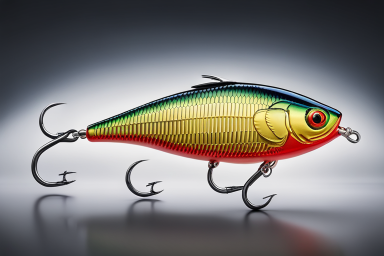 Stable Diffusion AI Prompt Fishing lure precisely mimics the exact shape and colors of a (((cobalt Perch))). A panoramic studio shot of the highly detailed cobalt colored ((Perch-shaped)) fishing lure with treble hooks designed to catch fish, centered product photography. A masterpiece product photo on a (black background).