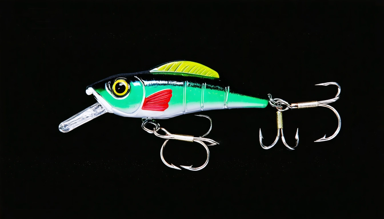 Stable Diffusion AI Prompt Fishing lure with fishing hooks like (((Dark Green Bass))). A studio shot masterpiece lure product photo centered on a (black background).
