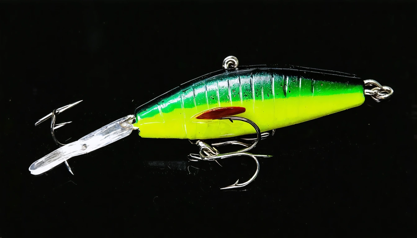 Fishing lure with fishing hooks like (((Dark Green Bass))). A studio shot masterpiece lure product photo centered on a (black background).