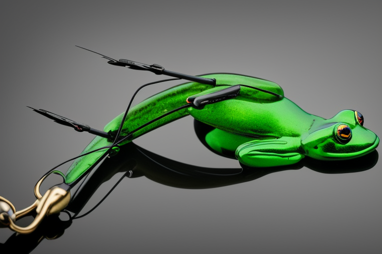 Stable Diffusion AI Prompt product photography of a fishing lure with hooks that looks like a Dark Green colored Frog!!!, (anatomically correct), futuristic, uhd, highly detailed, concept, product studio shot, panoramic shot, centered!!!, diffused lighting on a plain dark background, highly detailed, masterpiece, product photography by Jovana Rikalo