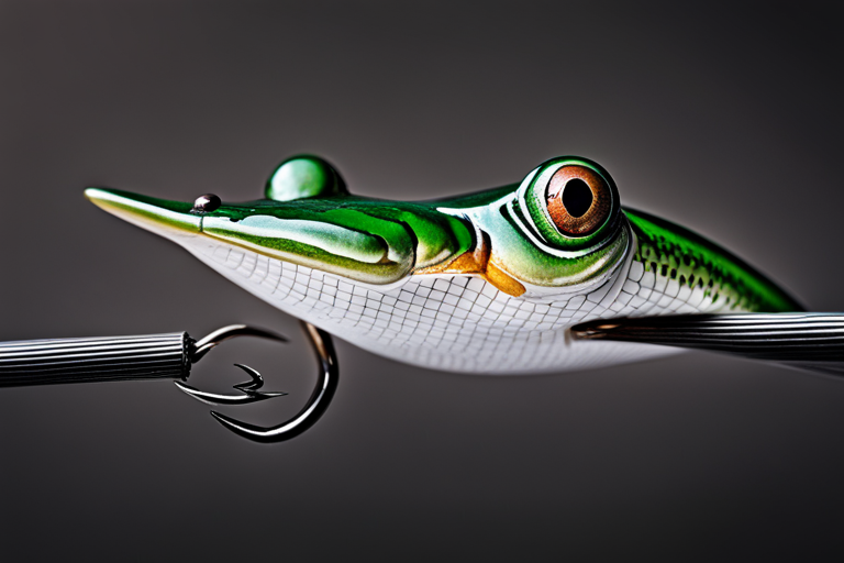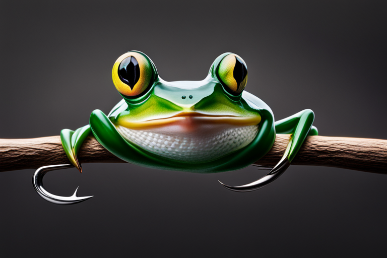 Stable Diffusion AI Prompt Fishing lure precisely mimics the exact shape and colors of a (((Dark Green Frog))). A panoramic studio shot of the highly detailed Dark Green colored ((Frog-shaped)) fishing lure with treble hooks designed to catch fish, centered product photography. A masterpiece product photo on a (black background).