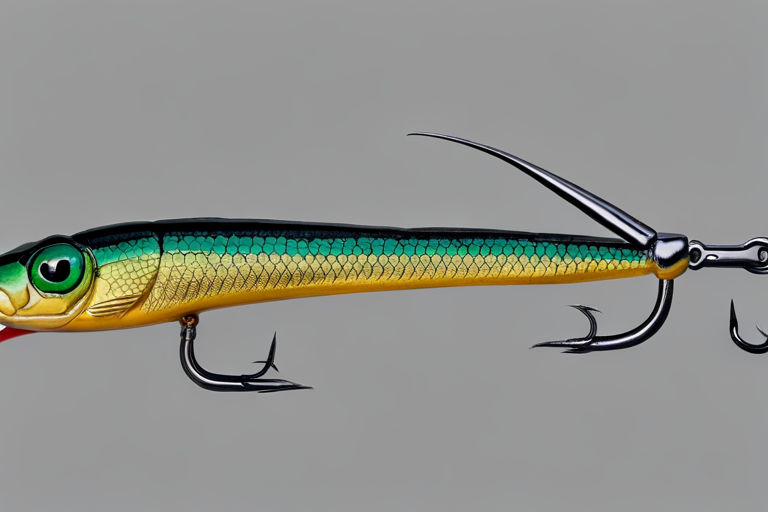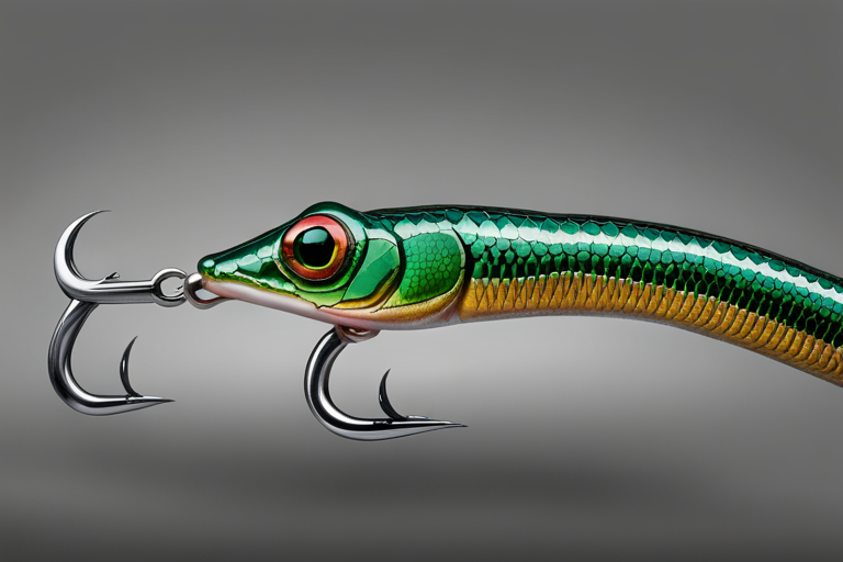 Stable Diffusion AI Prompt Fishing lure precisely mimics the exact shape and colors of a (((Dark Green Lizard))). A panoramic studio shot of the highly detailed Dark Green colored ((Lizard-shaped)) fishing lure with treble hooks designed to catch fish, centered product photography. A masterpiece product photo on a (black background).