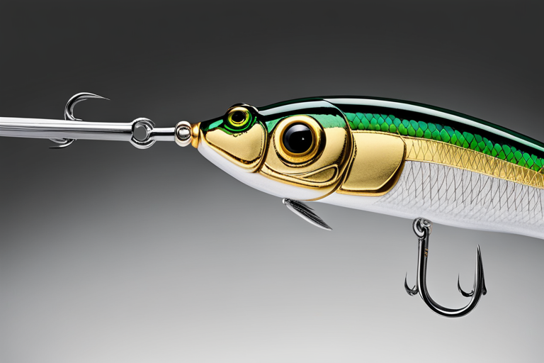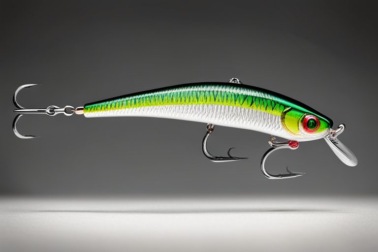Stable Diffusion AI Prompt Fishing lure precisely mimics the exact shape and colors of a (((Dark Green Minnow))). A panoramic studio shot of the highly detailed Dark Green colored ((Minnow-shaped)) fishing lure with treble hooks designed to catch fish, centered product photography. A masterpiece product photo on a (black background).