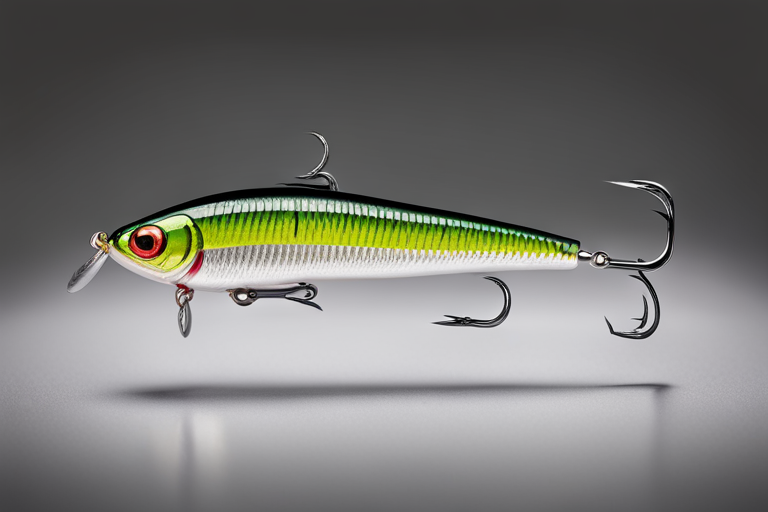 Stable Diffusion AI Prompt Fishing lure precisely mimics the exact shape and colors of a (((Dark Green Minnow))). A panoramic studio shot of the highly detailed Dark Green colored ((Minnow-shaped)) fishing lure with treble hooks designed to catch fish, centered product photography. A masterpiece product photo on a (black background).