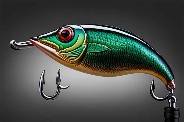 Stable Diffusion AI Prompt Fishing lure precisely mimics the exact shape and colors of a (((Dark Green Rodent))). A panoramic studio shot of the highly detailed Dark Green colored ((Rodent-shaped)) fishing lure with treble hooks designed to catch fish, centered product photography. A masterpiece product photo on a (black background).