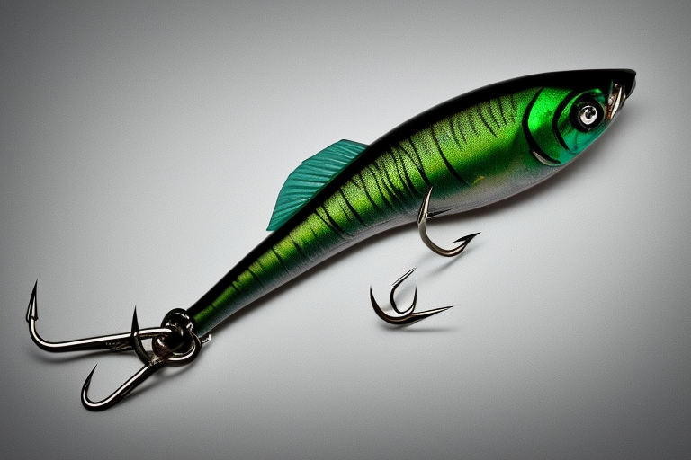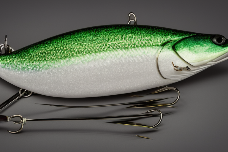 Stable Diffusion AI Prompt product photography of a fishing lure with hooks that looks like a Dark Green colored Shad!!!, (anatomically correct), futuristic, uhd, highly detailed, concept, product studio shot, panoramic shot, centered!!!, diffused lighting on a plain dark background, highly detailed, masterpiece, product photography by Wlop and Jovana Rikalo