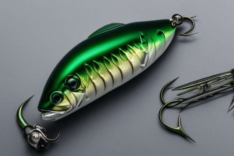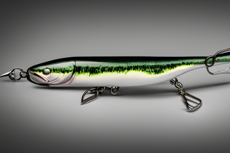 Stable Diffusion AI Prompt product photography of a fishing lure with hooks that looks like a Dark Green colored Shad!!!, (anatomically correct), futuristic, uhd, highly detailed, concept, product studio shot, panoramic shot, centered!!!, diffused lighting on a plain dark background, highly detailed, masterpiece, product photography by Wlop and Jovana Rikalo
