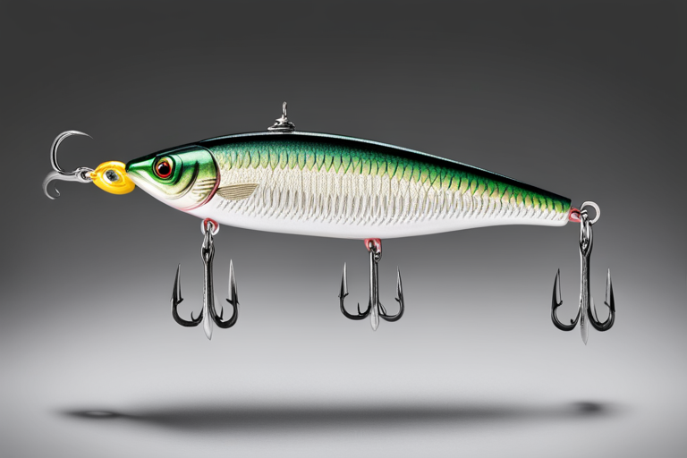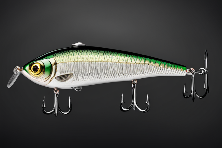 Stable Diffusion AI Prompt Fishing lure precisely mimics the exact shape and colors of a (((Dark Green Shad))). A panoramic studio shot of the highly detailed Dark Green colored ((Shad-shaped)) fishing lure with treble hooks designed to catch fish, centered product photography. A masterpiece product photo on a (black background).