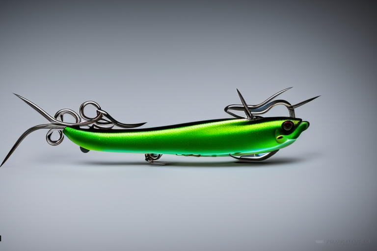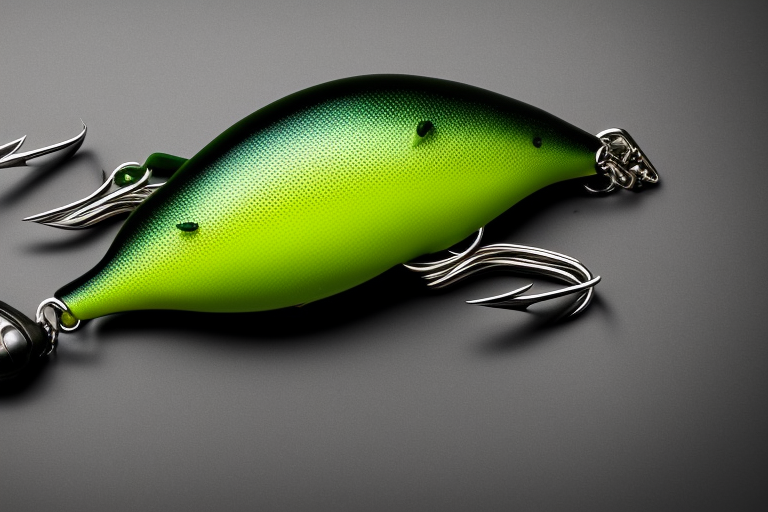 Stable Diffusion AI Prompt product photography of a fishing lure with hooks that looks like a Green colored Bass!!!, (anatomically correct), futuristic, uhd, highly detailed, concept, product studio shot, panoramic shot, centered!!!, diffused lighting on a plain dark background, highly detailed, masterpiece, product photography by Wlop and Jovana Rikalo