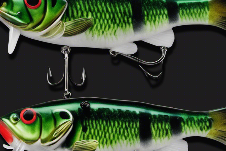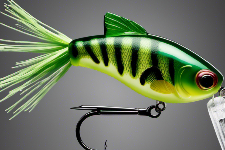 Stable Diffusion AI Prompt Fishing lure precisely mimics the exact shape and colors of a (((Green Bass))). A panoramic studio shot of the highly detailed Green colored ((Bass-shaped)) fishing lure with treble hooks designed to catch fish, centered product photography. A masterpiece product photo on a (black background).