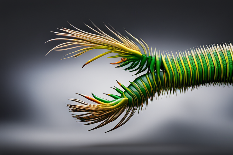 Stable Diffusion AI Prompt Fishing lure precisely mimics the exact shape and colors of a (((Green Centipede))). A panoramic studio shot of the highly detailed Green colored ((Centipede-shaped)) fishing lure with treble hooks designed to catch fish, centered product photography. A masterpiece product photo on a (black background).