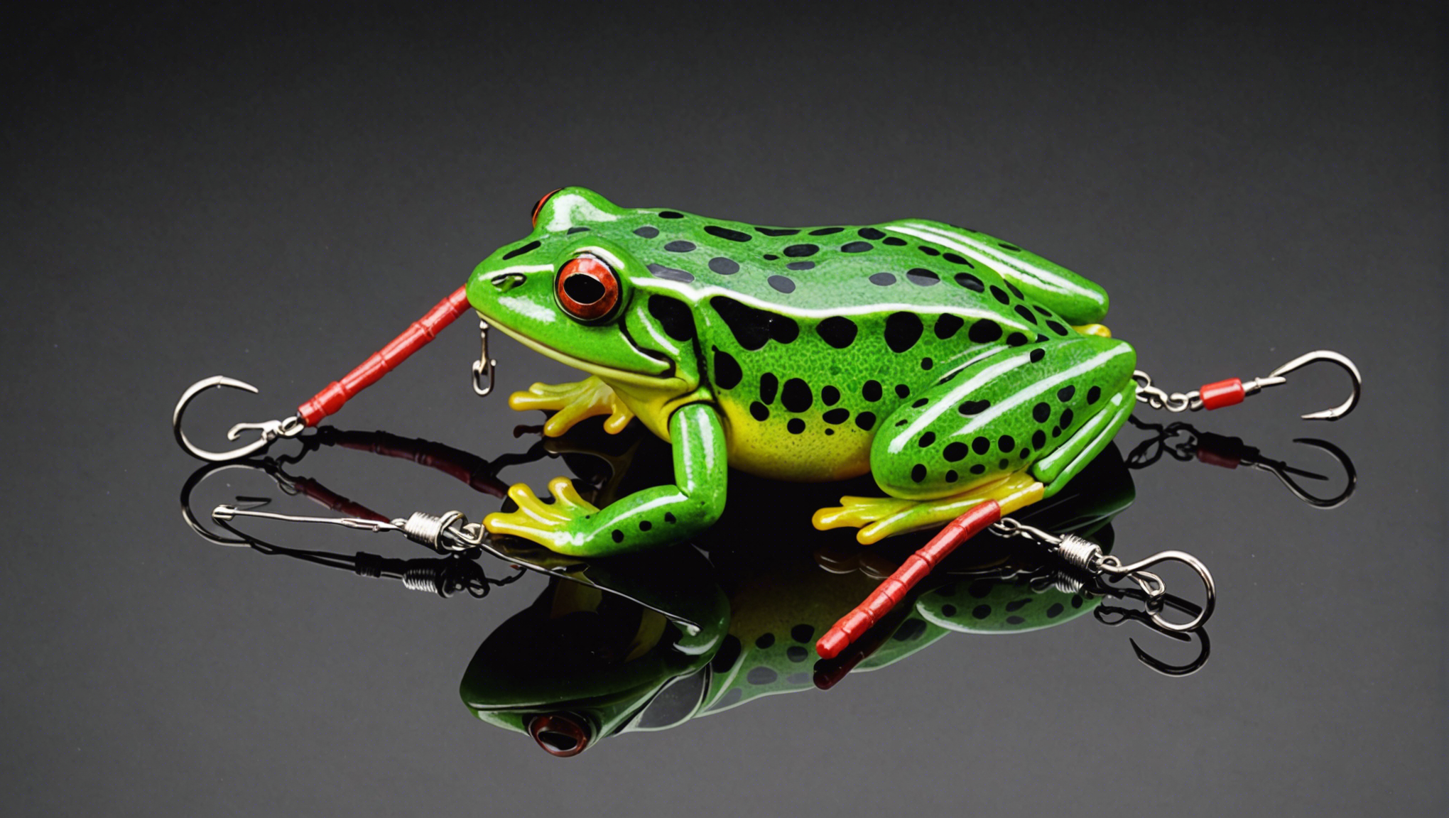 Stable Diffusion AI Prompt Fishing lure with treble hooks with shape and colors of a (((Green Frog))). A panoramic studio shot of the highly detailed fishing lure with treble hooks designed to catch fish, centered product lure photography. A masterpiece product photo on a (black background).